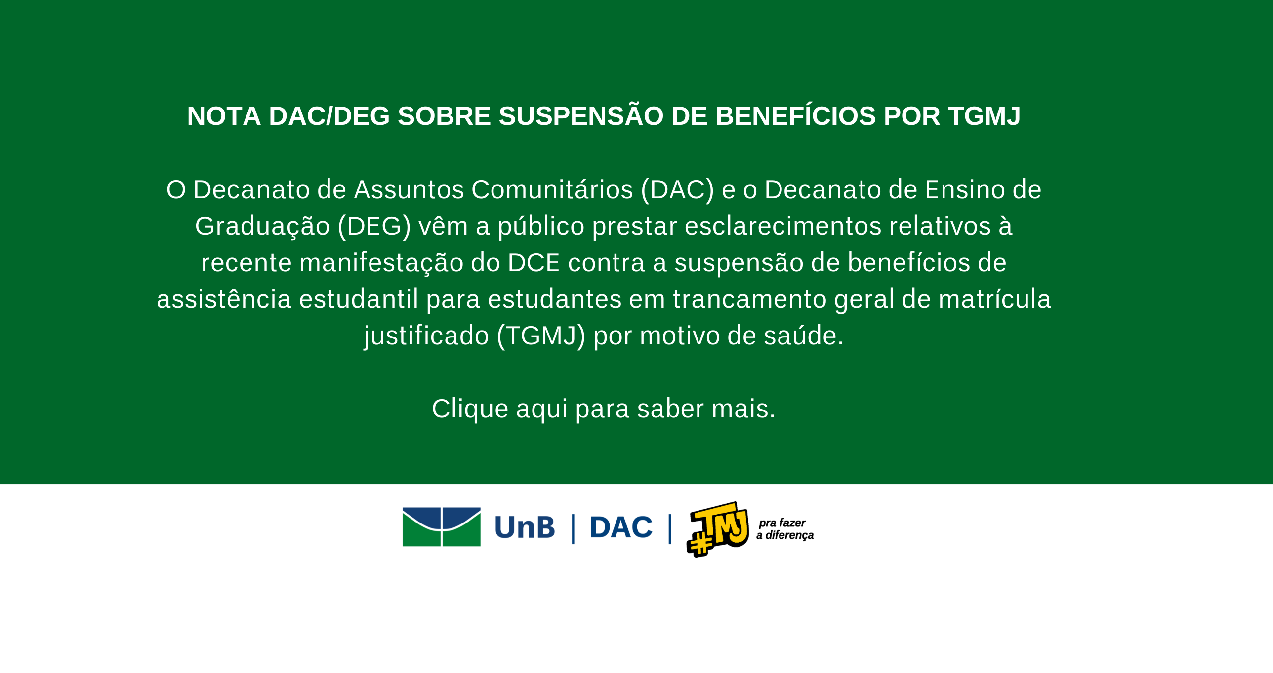 O Decanato de Assuntos Comunitários (DAC) e o Decanato de Ensino de Graduação (DEG) vêm a público prestar esclarecimentos relativos à recente manifestação do DCE contra a suspensão de benefícios de assistência estudantil para estudantes em trancamento geral de matrícula justificado (TGMJ) por motivo de saúde. Sobre o tema, impõe-se destacar: 1. A Resolução N° 25/2023 do CAD, que estabelece a Política de Assistência Estudantil da UnB, fruto de longo debate com toda a comunidade (incluindo 2 Conferências públicas e submissão a diversos coletivos, incluindo os superiores, CAC e CAD), de fato estabelece a suspensão te de aluno ativo na instituição. Ressaltamos que tão logo o vínculo seja reestabelecido o(a) estudante volta a receber o respectivo auxílio. 2. A Resolução do Decanato de Assuntos Comunitários N° 06/2023 estabelece condições especiais para estudantes que efetuarem TGMJ por motivo de saúde (Art. 43, §2º). 3. O Decanato de Ensino de Graduação esclarece que estudantes em situação de vulnerabilidade têm análise diferenciada das solicitações de trancamento justificado pela Diretoria Técnica de Graduação (Conforme Resolução CEPE N° 93/2028, Art. 11), e que existem mecanismos institucionais para garantir a continuidade do recebimento de auxílio nesses casos, com manutenção da segurança jurídica necessária. O DAC e o DEG se colocam à disposição para prestar esclarecimentos necessários, ao tempo que convidam a toda a comunidade a utilizar e divulgar fatos concretos sobre a assistência estudantil da UnB por meio do Relatório da Ação 4002 de 2023, recém aprovado, no link https://www.dac.unb.br/images/RELATRIO_AO_4002_2023_F.pdf, evitando-se fake-news desnecessárias. Atenciosamente,Decanato de Assuntos ComunitáriosDecanato de Ensino de Graduação